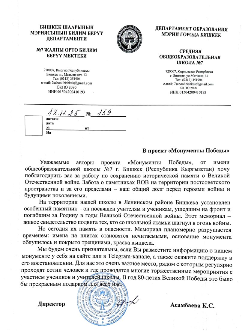 С просьбой помочь в восстановлении мемориала в адрес «Монументов Победы» обратилась директор школы №7 г. Бишкек К.С. Асамбаева.