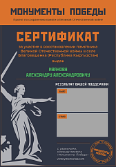 - Электронный сертификат с именной благодарностью от проекта за помощь в восстановлении конкретного монумента